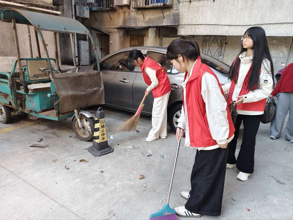 图为志愿者开展社区公共区域卫生打扫,助力环境美化