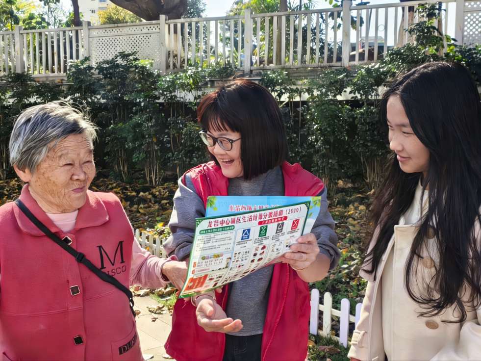 图为志愿者向社区老人讲解垃圾分类知识,手把手教学分类投放