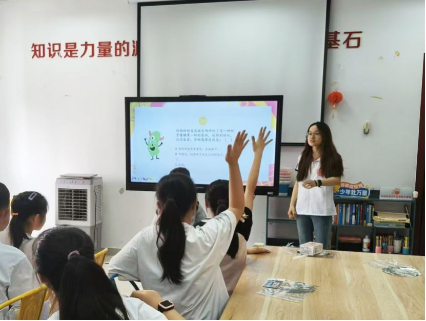 “怎么才能让孩子们喜欢听,听得进,记得住?”去往暑托班的路上,团队成员们还在交流探讨,如何将禁毒宣传与爱国教育有机结合,通过科普与游戏相结合的模式让孩子们筑牢禁毒防线。功夫不负有心人,课堂气氛热烈,孩子们积极参与、踊跃互动。实践团成员通过图文展示和动画短片介绍毒品种类与危害,以一问一答的方式当场考察学习成效,借助实物模具进行知识科普,在看一看、摸一摸、猜一猜中引导孩子们识别毒品原植物及伪装毒品。环环相扣,孩子们通过听、答、观、玩把知识记住了,将情感升华了。