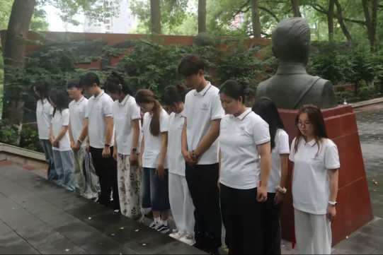 主持人宣布全体成员“默哀三分钟”后,原本轻拂的秋风仿佛也停下脚步,整个墓园陷入绝对寂静,这无声的缅怀引发了大家的情感共鸣。老师们、同学们垂首肃立,面向烈士墓庄严默哀,深切追思库里申科烈士用生命诠释的伟大国际主义精神。这种精神激励着后人铭记历史、珍惜和平,在面对不公与侵略时坚守正义,在需要奉献时勇于担当,让跨越国界的大爱与勇气永远传承。