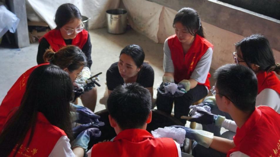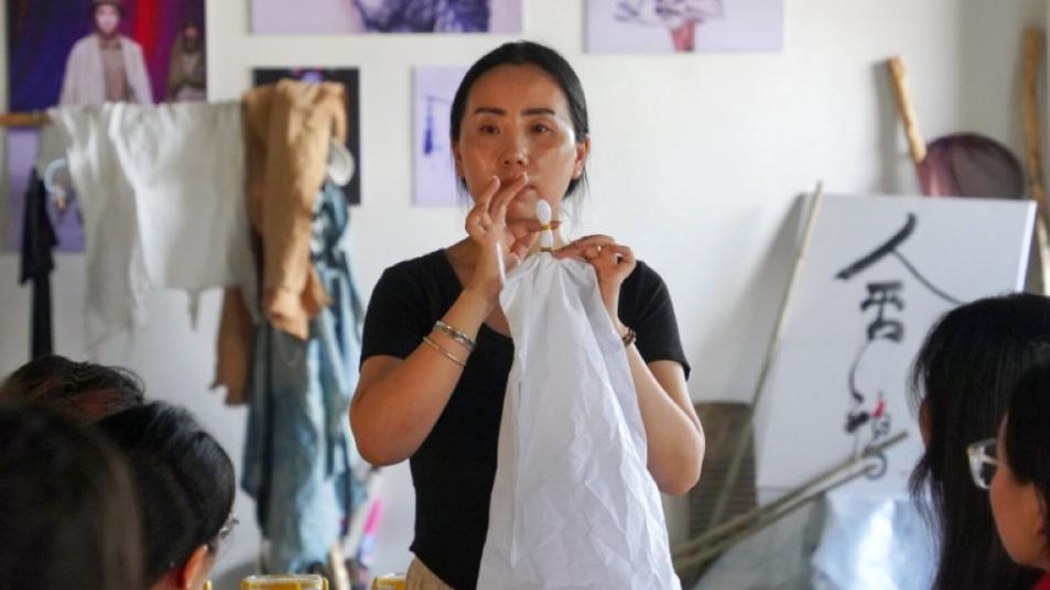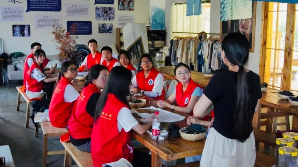 志愿者今天来到的無染工作坊是一家致力于传承与创新扎染技艺的乡村工坊。工坊主理人长期扎根乡村,积极探索传统扎染与现代时尚的融合路径。此前,工坊在村内的油菜田间成功举办“长江秀《無染》”田野时装艺术展,以广袤的油菜秆为天然廊柱,模特们身着蓝染、茶染、游牧三个系列共40余套扎染服饰穿梭于田野之间,扎染的蓝邂逅田野的绿,呈现出一场别具一格的视觉盛宴,吸引了众多游客与媒体的关注,进一步提升了长江村乡村旅游与文化产业的知名度与影响力。
