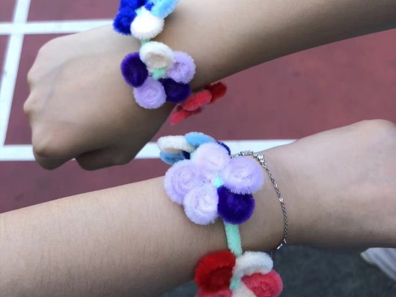在掌握了基本技巧后,同学们的创意如泉水般涌现。有的同学用扭扭棒编织出精致的小戒指,戴在手上闪闪发亮;有的同学则模仿向日葵的形状,制作了充满阳光气息的花朵;更有同学发挥想象力,做出了充满魔幻色彩的魔法棒和漂亮的手链。
