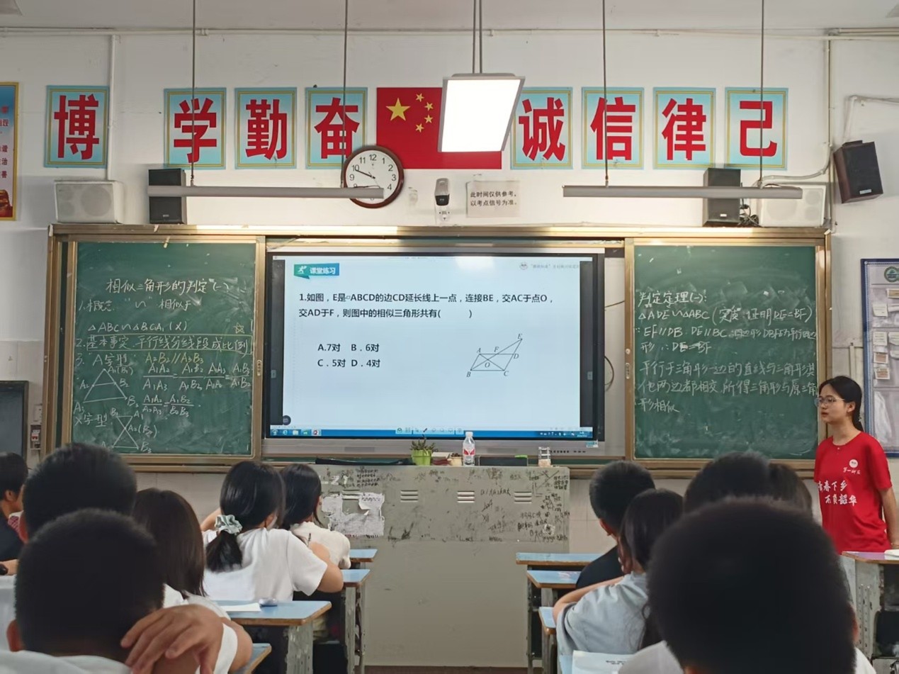 2025年7月12日,湖南第一师范学院数学与统计学院“数映红途”乡村振兴促进团在湘西古丈县民族中学继续开展趣味数学课堂。教学组成员邹烨以“相似三角形的判定”为主题,通过生动的实验和互动探究,带领学生们走进几何世界,感受数学的逻辑之美。课堂以生活实例为引,结合平行线分线段成比例的规律,让学生们在动手实践中领悟数学的严谨与趣味。