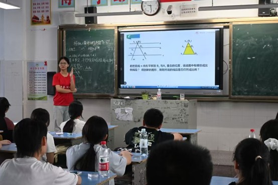 在探究环节,邹老师以问题串引导学生逐步深入:“如果平行线截的是三角形的两边,会得到什么结论?”学生们通过平移平行线,观察图形变化,发现所截线段依然成比例。邹烨老师适时引入“A型”和“X型”模型,结合动画演示,让学生直观理解平行线分线段成比例的推论。