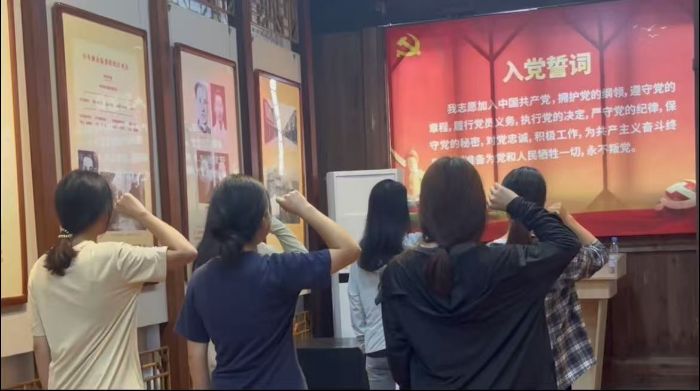 随后,实践队一行前往中共福州市委旧址。在这座见证了福州解放前夕斗争历史的建筑里,一张张珍贵的老照片、一件件锈迹斑斑的革命文物,串联起1947年至1949年间福州人民开展武装斗争、迎接解放的壮丽篇章。讲解员详细介绍了“福州学联”组织学生运动、“城工部”秘密发展党员等历史细节,同学们不禁为先辈们的智慧与勇气深深折服。在旧址庭院内,实践队成员整齐列队,面向鲜红的党旗举起右拳。“我志愿加入中国共产党,拥护党的纲领,遵守党的章程……”铿锵有力的宣誓声穿越时空,与当年革命先辈的呐喊遥相呼应。