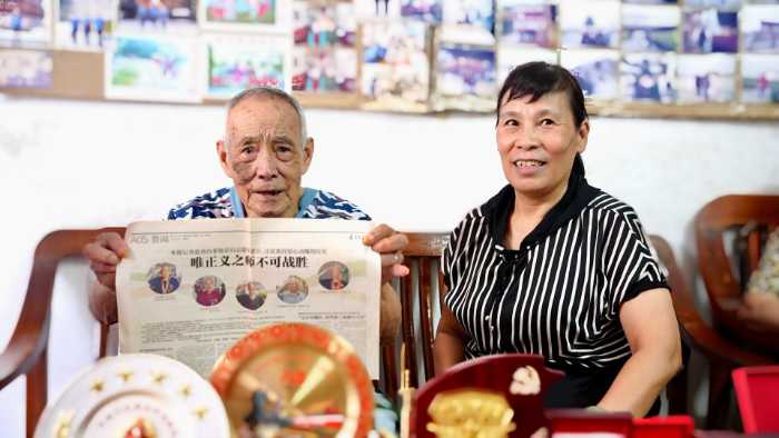 为传承红色基因,2025年7月15日,佛山大学携手童程实践团赴云浮罗定市泗纶镇,深度访谈抗战老兵、七旬老党员沈金水。在沈老家中,身着旧军装的老人眼神坚毅,满墙军装合影和“致敬英雄”牌匾无声诉说着往昔。他珍视地取出并轻抚铺满桌子的荣誉勋章,成员们通过其女儿沈小冰的转述,开启了跨越时空的对话。