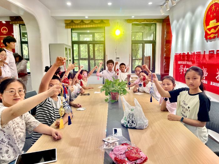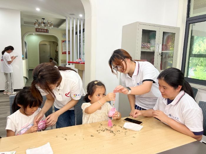首先,祝明若以充满地域特色的安徽中医小故事切入,用生动语言为小朋友们讲述中医药从萌芽到兴盛的千年发展脉络。接着,她带领小朋友们一起学习《中医谣》,逐句解析“阴阳五行”“理法方药”等核心概念,通过集体诵读与视频学习,带孩子们领略中医文化的韵律之美。随后,祝明若围绕夏季健康主题,开设趣味课堂,将刮痧防中暑技巧、食疗解暑方及草药驱蚊窍门等知识,转化为贴近生活的生动讲解。最后,团队成员化身“小导师”,指导小朋友们通过趣味拼图的方式观察药材形态、学习药用价值,进一步巩固中医药知识,并分组带领小朋友们手工香囊制作,从选料、缝制到填充全程耐心指导。小朋友们捧着亲手制作的香囊,与团队成员合影留念,欢声笑语中,中医药文化“可触可闻”的独特魅力得以生动展现,在孩子们心中种下了传承中医药文化的种子。