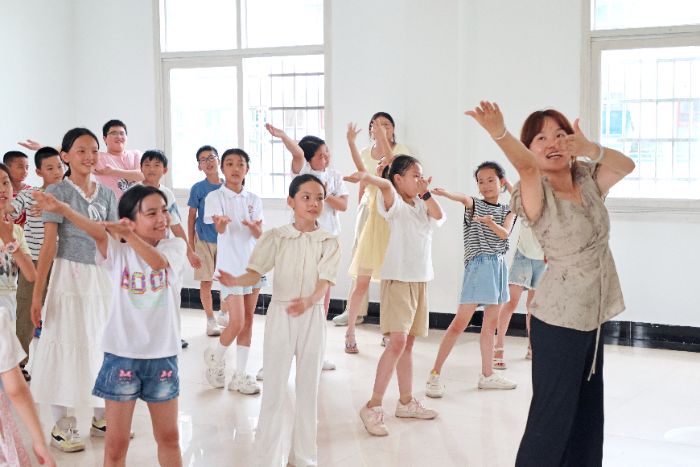 团队成员姚丹教学生跳民族舞
