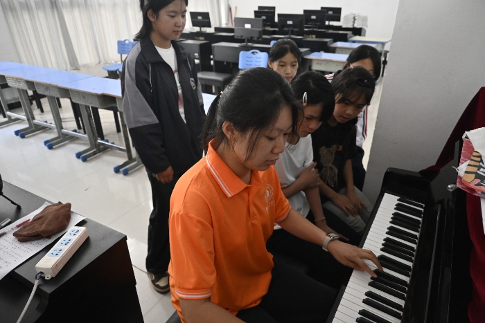 弹钢琴体验活动则为孩子们打开了艺术之门。民族中学为实践队员提供钢琴,队员们先为孩子们演奏了几首简单动听的乐曲,随后教孩子们认识琴键、学习基本的弹奏技巧。虽然孩子们大多是第一次接触钢琴,但他们学得格外认真,在队员们的指导下,渐渐能够弹出简单的旋律。