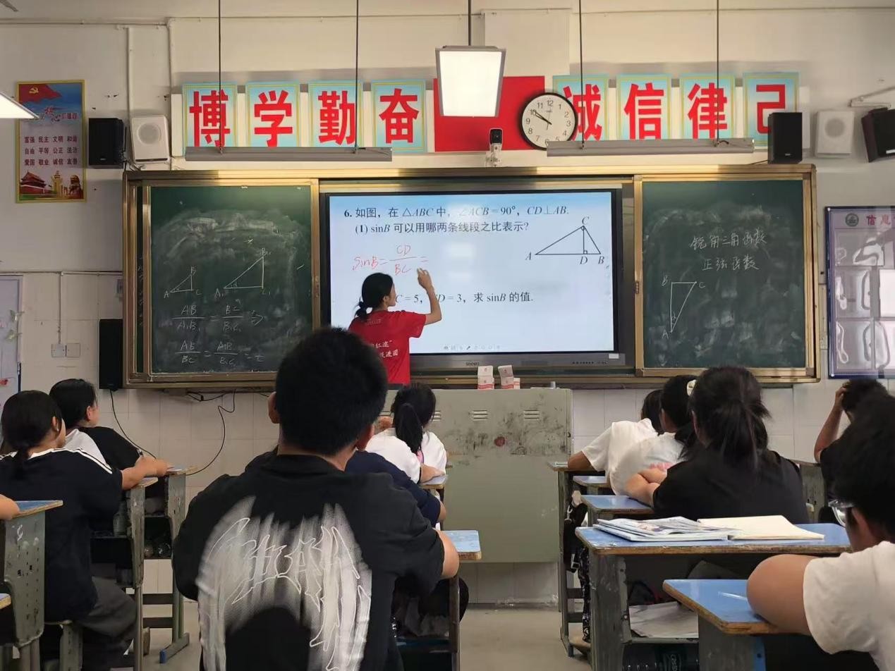 在探究环节,唐单倩老师组织学生分组合作,通过绘制不同比例的直角三角形,观察30°、45°角所对边与斜边的比值规律。“无论三角形大小如何变化,这个比值竟然始终保持不变!”学生们通过测量计算,自主发现了正弦函数的恒定特性。为验证猜想,学生们还利用几何画板动态演示了角度固定时对边与斜边的比例关系。教学组组长向素妍在巡视指导时强调:“数学规律往往隐藏在我们习以为常的现象中,关键是要学会用数学的眼光观察世界。”