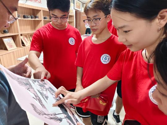 03 随后,邂逅山花剪纸艺术。非遗传承人示范剪、刻、染技法,队员们专注学习,红纸在指尖化作灵动图案,体悟传统技艺的精巧。