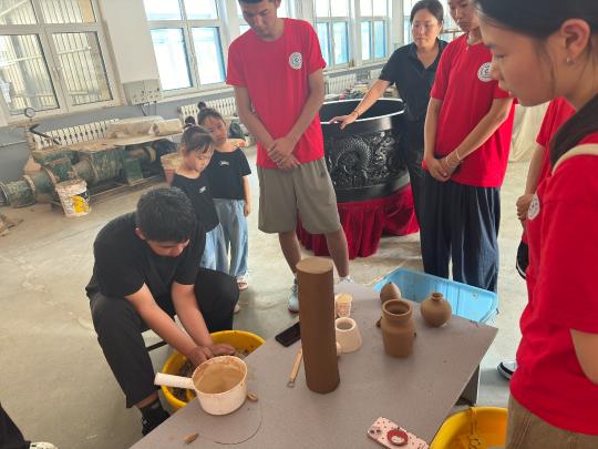 02 随后志愿者团队开启非遗深度体验之旅。先是投身于黑陶制作,触摸细腻陶土,在匠人指导下尝试拉坯、雕刻,感受黑陶“薄如纸、亮如漆”的独特质感,于泥土蜕变中,探寻非遗文化的厚重底蕴,坚定传承创新的使命。