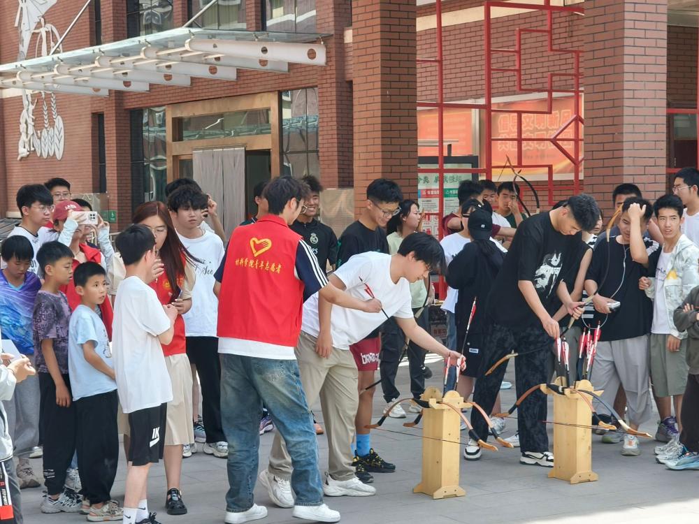 (图为弓箭协会与实践队共同教小朋友学习弓箭的场景 供图:贾铭萱)