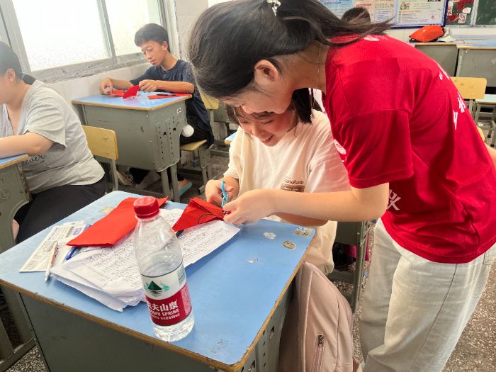 实践环节成为课堂的高潮。两位老师分工指导:邹烨老师示范五角星、六角星的折叠剪法,强调“36度角对折”“沿斜线剪裁”的关键步骤;张煦涵老师则手把手教大家剪制团花与蝴蝶,从正方形纸的四次对折,到柳叶纹、桃形孔的镂空技巧,耐心纠正学生们的运剪角度。