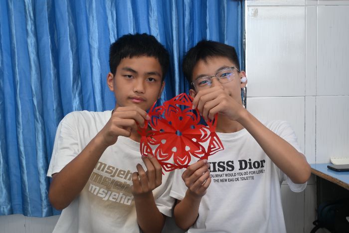 当学生们展开手中的作品——有的是棱角分明的五角星,有的是纹样繁复的团花,还有的是振翅欲飞的蝴蝶——成就感溢于言表。两位老师还鼓励大家发挥创意,在传统图案基础上添加现代元素,让剪纸艺术焕发新活力。