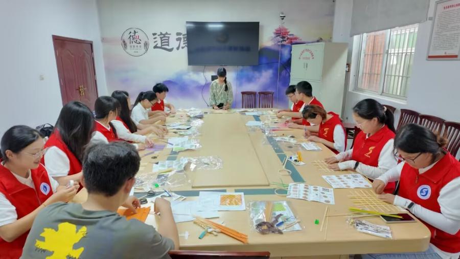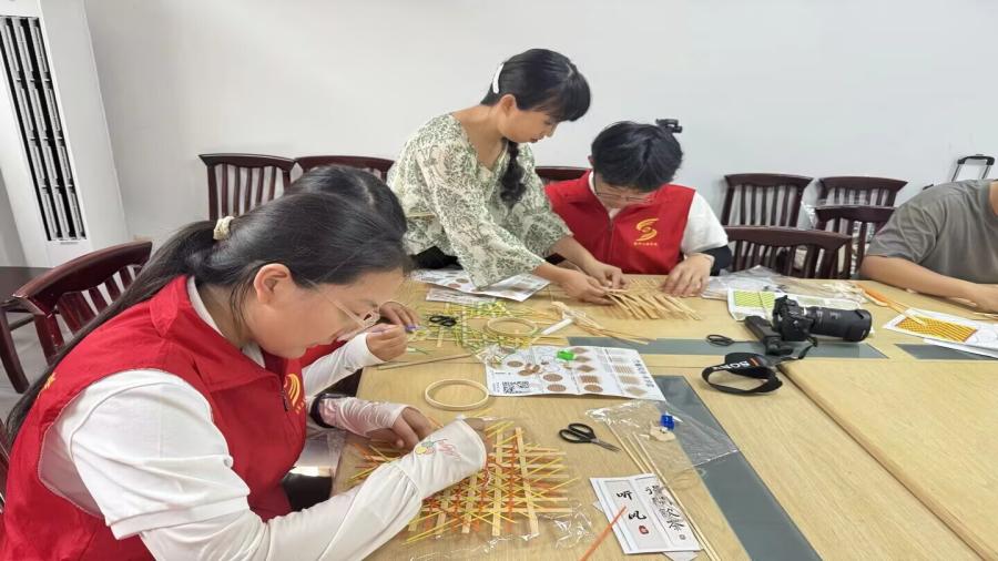 这看似简单的竹编,在编织过程中,志愿者们却屡屡遭遇难题。有时编错了位置,整个纹路就会错乱;有时拼凑不紧凑,无法达到预期效果,这让志愿者们深切体会到竹编工艺的精细与不易,也明白每一件精美竹编作品背后都凝聚着匠人的耐心与专注。编织过程中,大家边做边交流,分享着各自的经验,遇到困难时相互提醒、出谋划策。编制完成后,大家纷纷展示自己的成果,工艺扇造型各异,风铃小巧精致,虽然算不上完美,却都是大家用心制作的成果,现场洋溢着志愿者们满满的成就感与欢声笑语。