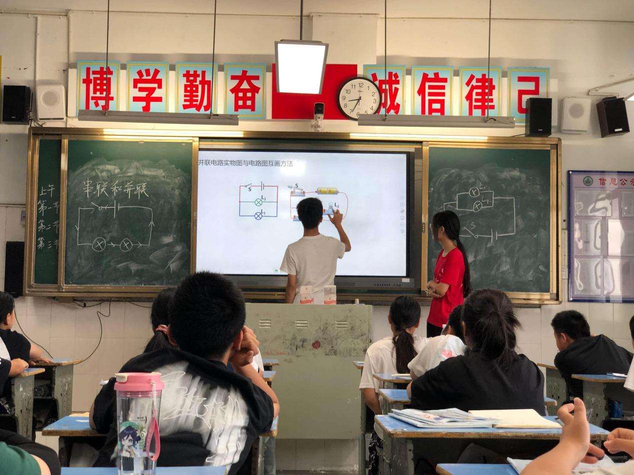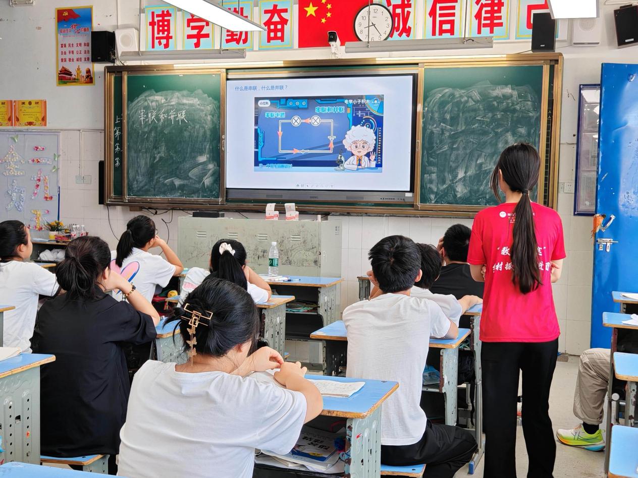 2025年7月16日,古丈县民族中学传来阵阵热烈讨论声,湖南第一师范学院数学与统计学院“数映红途”乡村振兴促进团教学组的夏坤荣老师,正在为同学们带来一堂生动有趣的物理课——串联和并联知识的学习。