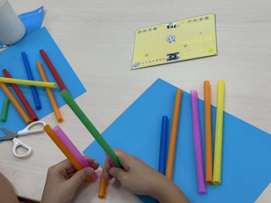 课堂一开始,课桌上五彩缤纷的吸管便立刻吸引了孩子们的目光。面对孩子们好奇的疑问,授课老师笑着回答:“这可不是普通的吸管,它们马上就会变成能唱歌的‘吸管排笛’!”孩子们纷纷瞪大双眼。在老师分步演示后,孩子们化身小小工匠,迫不及待地投入制作:剪裁吸管、粘贴固定、密封底口。一时间,教室里剪刀的“咔咔”声、胶带的“撕拉”声此起彼伏,热闹非凡。在助教老师的协助下,孩子们仔细调整吸管长度、认真封口,直到每一根吸管都笔直、整齐、不漏气才满意。孩子们专注的眼神、稚嫩的动作展现着专注与热情,无不透露出对即将诞生的乐器的期待。当一支支色彩斑斓的排笛在孩子们手中诞生,教室里立刻变成了欢乐的音乐海洋。各种清脆或稚拙的音符此起彼伏,孩子们兴奋地站起身,争相吹响自己的作品,脸上洋溢着成功的喜悦。
