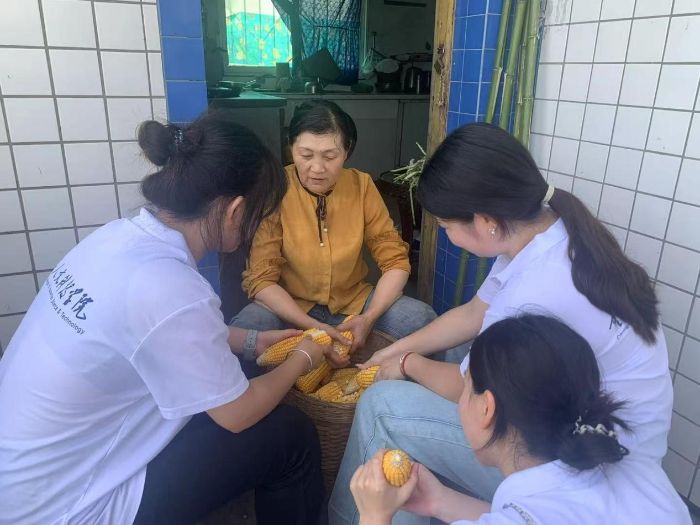 田间调研,特色种植筑基,科技赋能增产。离开村民家,实践团走进田间地头,实地考察二渡村的特色种植产业。夏季的田野里,1985特色玉米长势正盛,饱满的玉米穗预示着丰收。“这玉米是私人种植,亩产约800斤,虽然除去施肥和人工费后利润不算高,但也是家里重要的收入来源。”村民介绍道。