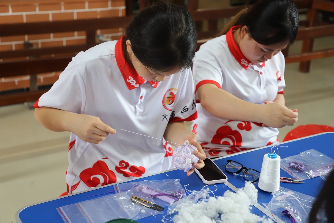 图为团队成员在靖西市壮锦厂体验绣球制作