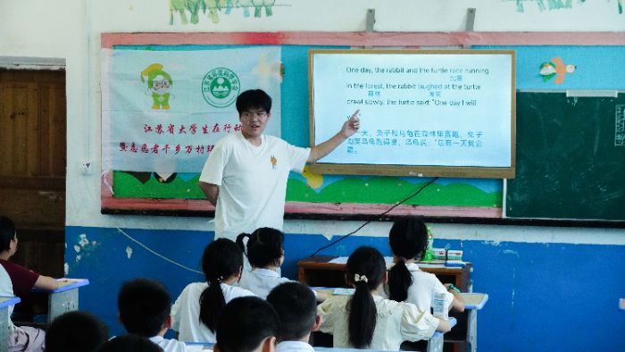 当日课程中,英语教学扎实推进。支教团成员卢子浩在英语课上,以学生熟悉的《龟兔赛跑》寓言故事为载体,引导学生快速适应英语版本,并融入新词教学,实现趣味与知识的结合。支教团成员侯卓岚则延续词性教学,聚焦情态动词与形容词,通过生活情景模拟对话及句子填空练习,帮助学生巩固所学,夯实语言基础。