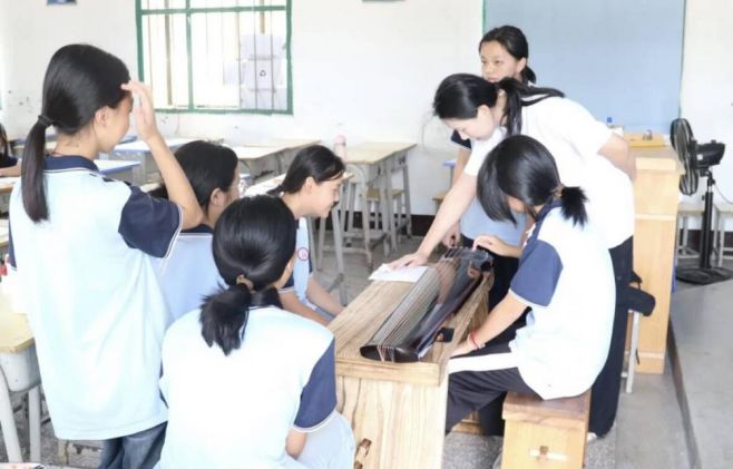 弦歌古韵,诗乐相融实践队员曾王渝、翁幸婷依托“唱经典”课程将古琴弦歌带进校园,带领学生感受传统文化的雅致与浪漫。队员曾王渝先以“区别古琴与古筝”的趣味活动为课程导入,详细介绍并展示了古琴。翁幸婷则重点讲解了《诗经·桃夭》的字词与思想内涵,以《诗经·桃夭》为范本用古琴弹奏其古朴旋律。在课堂中,学生们逐句学唱“桃之夭夭,灼灼其华”,理解诗句中对美好生活的赞颂。学生们在课后感叹道,原来古诗可以这么美。