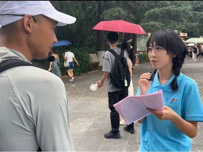 游客互动:传递古建力学科学价值 7月12日,实践团成员们积极与明孝陵的游客进行访谈交流,内容涵盖明孝陵的历史文化背景和建筑结构特点。团队成员们运用通俗易懂的语言,在访谈的过程中向游客们介绍明孝陵建筑中的力学知识,从石材的承重原理到拱券结构的分力机制,从建筑群的抗震设计到排水系统的流体力学应用,都被生动地呈现出来。许多游客表示,通过河海学子的专业讲解,他们不仅了解了明孝陵的历史价值,更深刻认识到古建筑中蕴含的科学智慧。