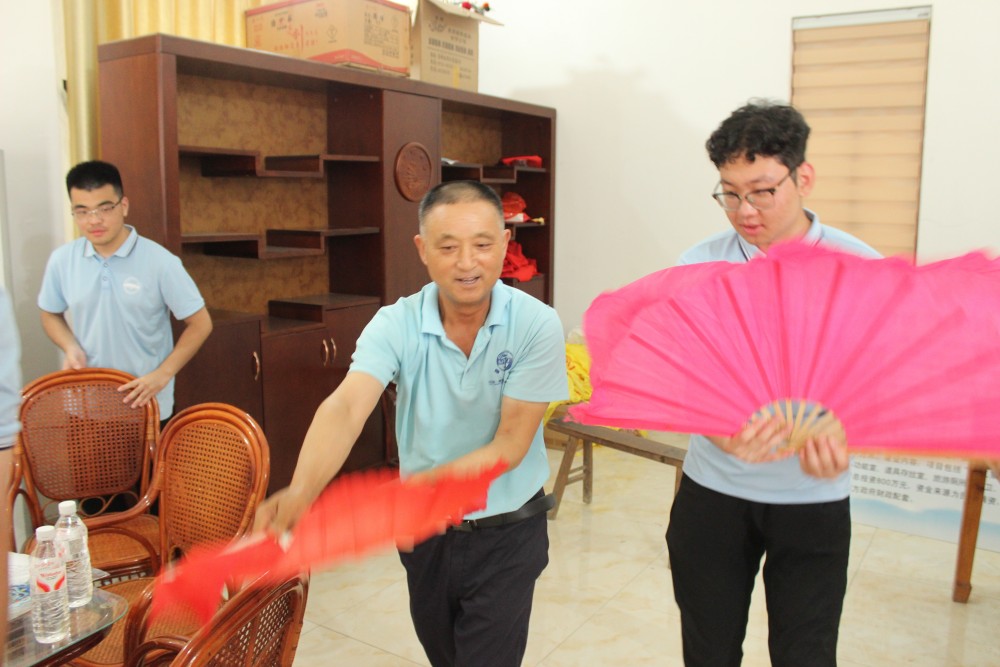 采访中,周馆长热情地向实践团成员回溯五猖戏的历史脉络,讲述自己与五猖戏相伴的岁月,每当提起这些,他眼角眉梢满是笑意,自豪之情溢于言表。作为五猖戏第一人,周馆长扮演了数十年“和尚”,哪怕已经是退休的年纪,也仍扎根五猖戏传承第一线。在现场,周馆长还示范起五猖戏中“和尚”角色的动作:看似简单的轻移金步、翻飞扇影,实际操作起来却暗藏玄机,难以把控。团队成员亲身体验后方知,所谓“台上一分钟,台下十年功”,正是对这份技艺的生动诠释。