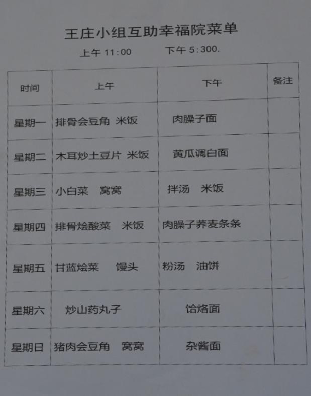 幸福互助院分为张村和王村两个小组,老年人年龄在65-80岁之间,为老年人提供差异性服务。每日菜单由营养师专门设计,荤素搭配,营养美味有个性,很大程度上改变了部分老人长期食用剩饭的生活习惯,老年人在此吃得营养又幸福。这不仅为老年人提供了便利,还减轻了子女赡养父母不到位的心理负担。幸福互助院的人文关怀也温暖人心,逢年过节还会准备饺子宴、长寿面,老人们围坐吃饭比在家还热闹。