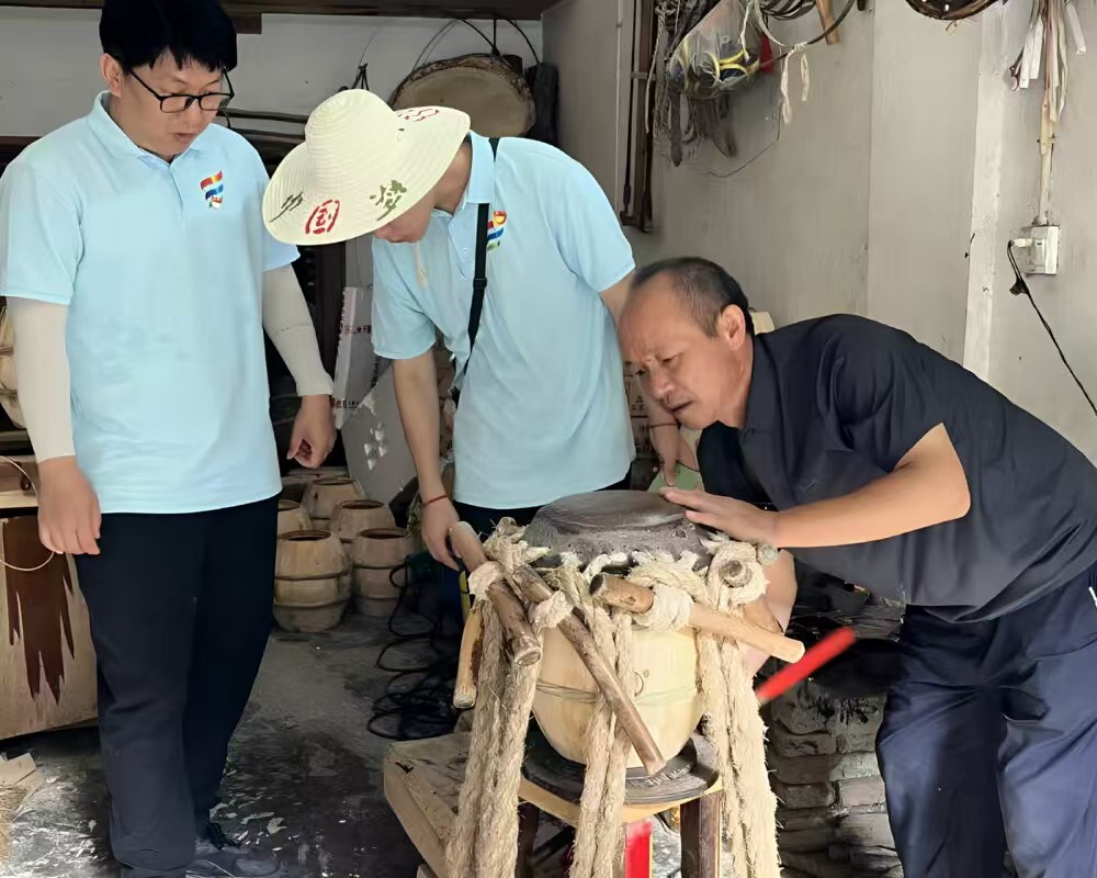 师生们围拢过来,祝明建老师递过鼓槌,指导老师厉昌晓率先尝试,初时节奏稍乱,在“放松手腕、跟准节拍”的提示下渐入佳境。同学们也踊跃接过鼓槌,有的轻敲出细碎的轻响,有的用力敲出响亮的节奏,小院里悠悠鼓声与时代青春碰撞,绘就了一幅薪火相传的动人画卷。