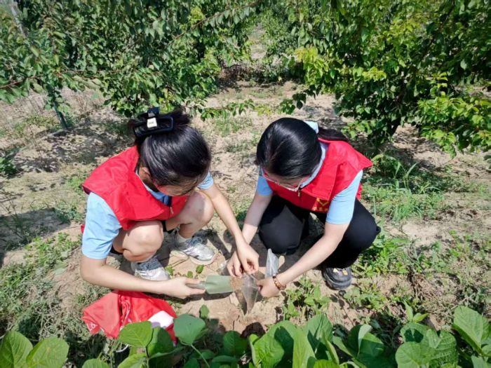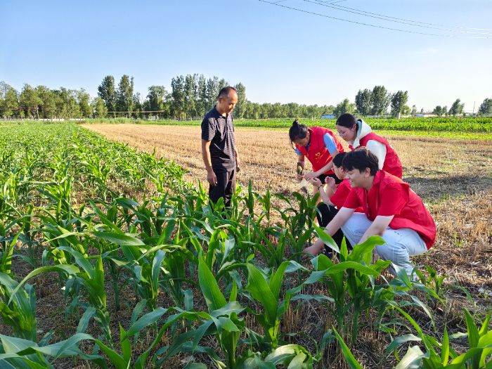 “咱们种庄稼一亩地该施多少肥才合适?地里的空间还能咋利用得更充分?”在村书记带领下,实践队员们顶着烈日,深入田间地头,细致考察主要农作物的生长状况,与当地农户展开深入交流。围绕农作物种植中的施肥量、田间空间利用等问题切入,实践团成员结合专业知识,讲解科学施肥的原理,提醒大家避免盲目追肥导致土壤板结;介绍“高矮间作”等立体种植模式,助力农户提高土地利用率。团队成员在田间仔细查看作物生长状态,取样检测土壤酸碱度,和农户就种植过程中的难点与需求进行深入沟通和交流,结合专业知识向农户介绍科学种植的思路和方法,分析优化作物生长环境、提升产量质量的可能性。本次实践活动不仅为深入解析本地优势作物的性状表现与环境适应性奠定了坚实基础,更将为后续在定点帮扶地区开展良种精准选育、优化栽培管理、制定增产增收措施提供关键的数据支撑。