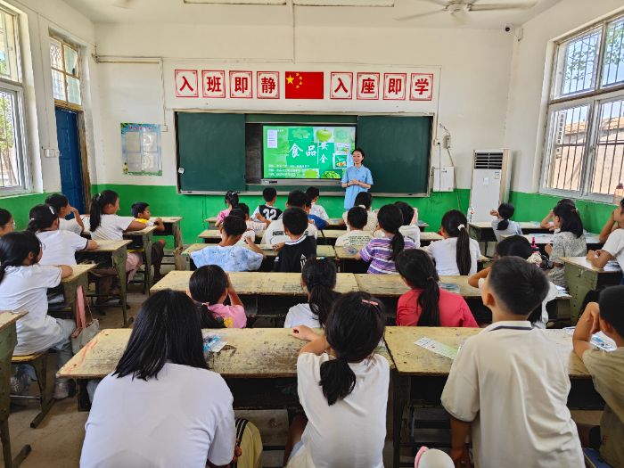 食品添加剂都是“敌人”吗?变质过期食品还能吃吗?怎样才能均衡营养健康成长呢?实践团分别走进龙王庄镇西屯村村委办公室和杨集乡东桑庄村小学,为孩子们带来一场别开生面的食品知识科普课堂。团队成员们生动形象地向小朋友们普及食品添加剂、食物毒素、食品保质期以及平衡膳食宝塔等知识。在讲到变质食品的识别,团队成员带着大家找“蛛丝马迹”——看色泽、闻气味、摸质地;讲到六大营养素的时候,志愿者边说边比划:“碳水化合物是‘能量加油站’,米饭、面条里全是它,为日常活动供能;维生素则像代谢调节的‘助手’,新鲜蔬果是它们的主要‘藏身地’,缺了哪一种,身体机能都可能打折扣”等等。为增加大家的参与感,团队成员们现场指导小朋友计算食品保质期、查看食品配料表,通过互动小游戏和问答环节,让大家在轻松愉快的氛围中,掌握更多实用的食品安全与营养知识,食品安全意识和自我保护能力得到显著提高。