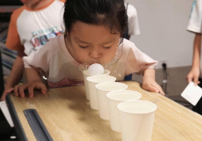 趣味竞技:六大游戏点燃运动热情活动设置的6个游戏各具特色,既考验团队协作,又充满竞技乐趣,让孩子们在欢声笑语中感受运动魅力。小球过河游戏中,桌上纸杯依次排开,盛满清水的杯盏中漂浮着乒乓球。孩子们需用气息将球从第一个杯子“吹”到最后一个,中途掉落便需重新开始。两队五人轮流接力,脸颊因用力而泛红,眼神却紧紧锁定乒乓球,计时排名的规则让赛场充满紧张感。每个游戏结束后,队员们为小队盖上印章并记录分数。孩子们小心翼翼保管集章券,上面的印章既是荣誉的见证,也是通往兑奖区的“通行证”。