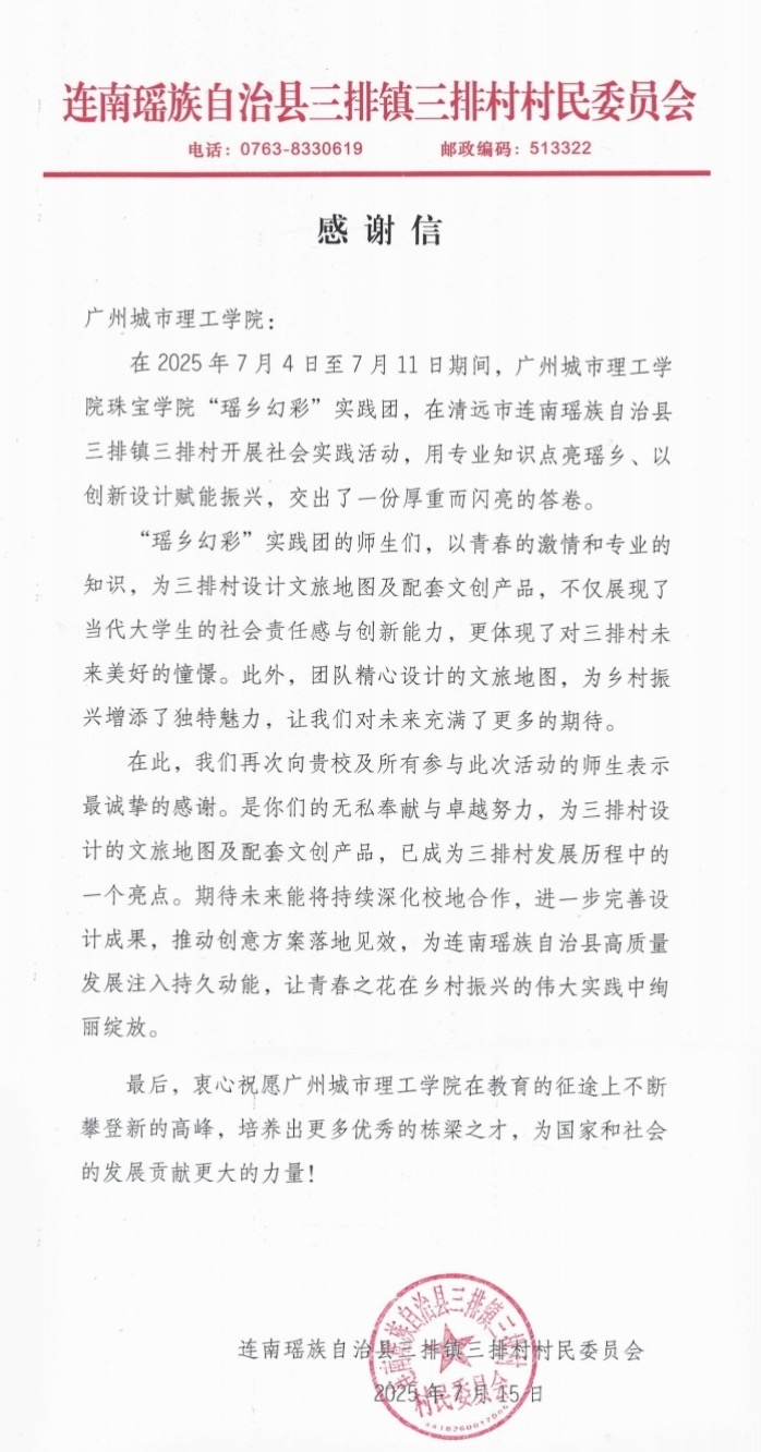 本网讯(罗蕴瑶)为深入贯彻广东省“百县千镇万村高质量发展工程”的战略部署,推动高校专业资源精准对接乡村振兴需求,广州城市理工学院珠宝学院“瑶乡幻彩”实践团在指导老师梁冰、许智鹏的带领下于7月4日到15日在清远市连南瑶族自治县三排镇开展社会实践活动。实践团在三排镇这片瑶族文化沃土上,以扎实的调研和创新的实践,交出了一份融合文化传承与促进乡村振兴的亮眼总结性成果。
