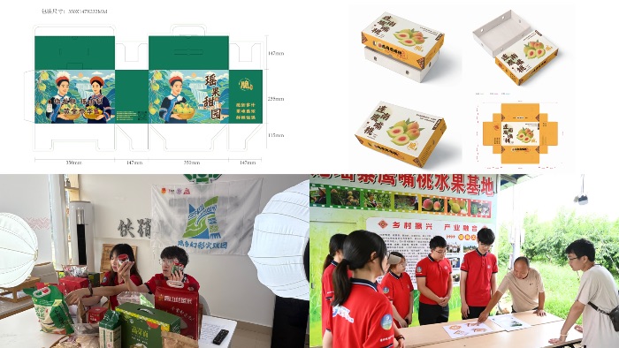 聚焦特色产业,助力农产品提质升级在墩龙瑶寨水果基地,实践团深入田间地头,调研当地鹰嘴桃等特色农产品的种植、销售情况,在与连水村党总支书记唐亚木贵的采访中,实践团成员探讨了鹰嘴桃的产业优势及线上线下销售体系的建设痛点。针对提升农产品附加值、拓宽销路的核心需求,实践团成员为农产品制作了两款专属包装,以专业优势提升产品附加值和农产品市场竞争力。实践团还为墩龙瑶寨水果基地拍摄了开园预热视频,视频通过“连南发布”微信公众号发布,有效扩大了基地的知名度和影响力,为开园活动起到了良好的宣传引流作用。此外,成员们化身“带货主播”,通过直播镜头向网友推介连南特色农产品,讲述瑶乡故事,助力农产品“出村进城”。这场直播不仅拓宽了销售渠道,更是一次“互联网+农业”的创新实践。