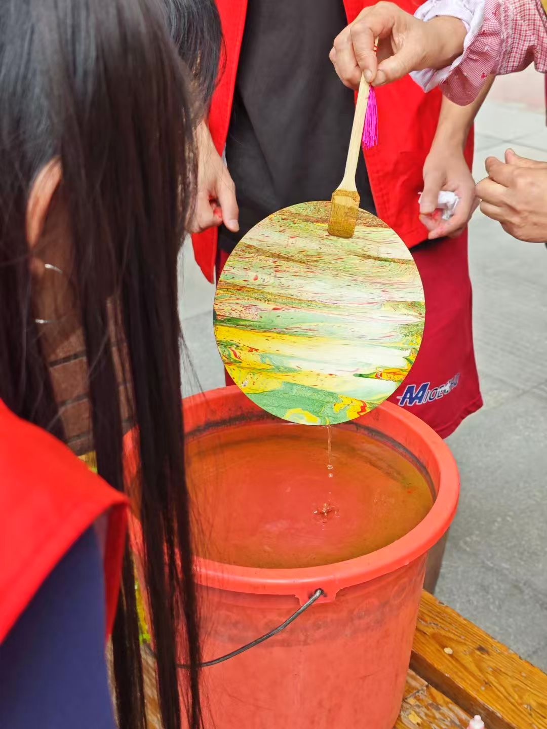 活动伊始,志愿者们提前准备好了素白的扇面、安全环保的颜料和水桶,并耐心讲解了漆扇绘制的基础技巧。实践队员先为孩子们做了示范,然后,就让孩子们自己动手,鼓励孩子们发挥想象,用色彩表达内心世界。