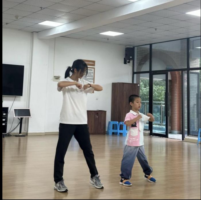 以五步拳为基础,结合单拍脚、仆步抡拍、抡臂砸拳等组合动作,团队成员从抱拳礼开始,逐步教授武术的攻防节奏。孩子们从动作僵硬到流畅有力,眼神从羞涩躲闪到坚定自信,武术不仅锻炼了他们的身体协调性,更磨砺了坚持到底的毅力。