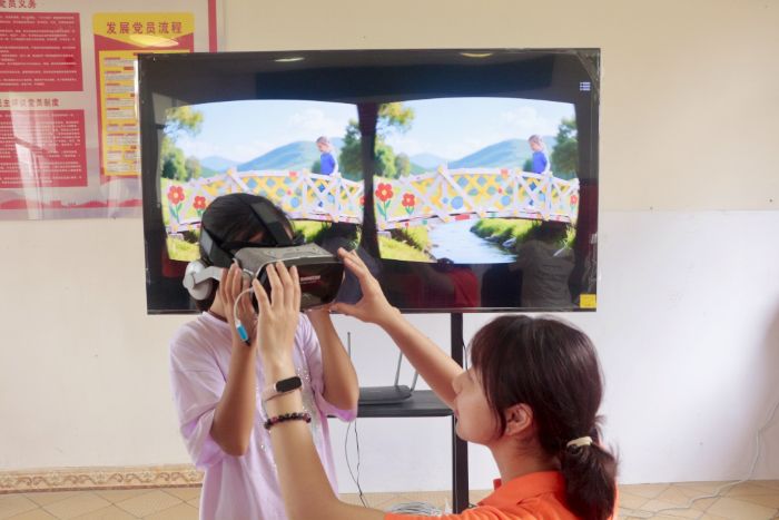 科技筑梦:纸桥里的家乡未来 为了点燃孩子们心中更大的工程梦想,服务队巧妙地运用科技让冠军组纸桥“走出”课堂。首先利用AI图像生成工具,输入冠军组纸桥的关键结构特征和乡村常见场景关键词。冠军组纸桥瞬间“化身”为溪流上的竹木小桥、连接田埂的坚实便桥。接着,服务队将生成的图片导入VR眼镜里,当孩子们戴上VR眼镜,他们看到小朋友脚下踩着的正是以他们冠军纸桥为原型“建造”的乡村小桥,他们可以“走”上桥面,低头观察桥下熟悉的加固结构如何支撑行人。这一刻,抽象的工程原理变成了可触摸的家乡未来图景。