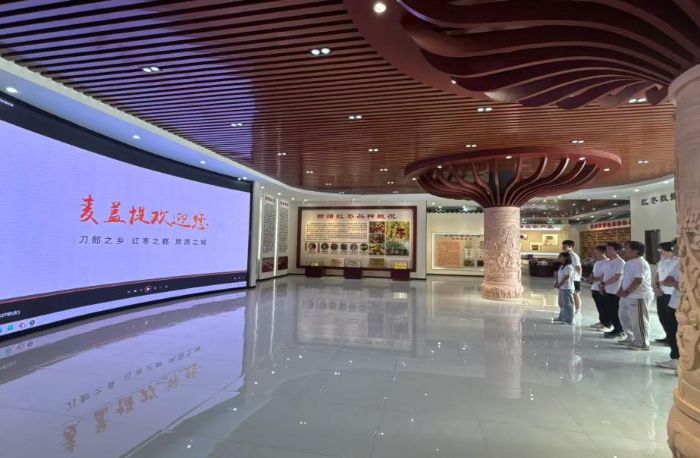当日,在研究院开热木拉·阿布都艾尼老师的带领下,实践团开启了参观之旅。活动伊始,老师热木拉·阿布都艾尼播放了一段主题宣传片,生动展现麦盖提红枣产业的发展历程、科研成果与品牌价值,让成员们对当地红枣产业的宏伟蓝图有了宏观认知。