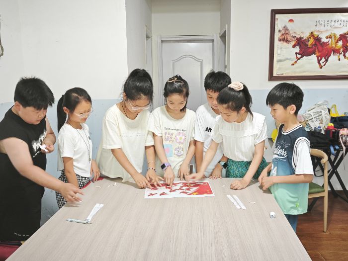 图为小朋友们在背景纸上粘贴和平鸽 陈苗摄