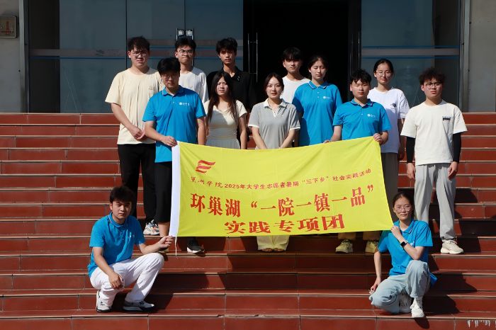 (图为实践团成员与王副书记合影,图中黄色旗帜为“环巢湖‘一院一镇一品’实践专项团”队旗 张玉玺摄)