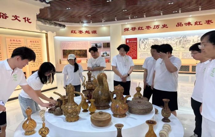7月8日,实践团继续前行,走进麦盖提红枣产业研究院,通过实地参观、实践操作与访谈交流等多种形式,深入挖掘沙漠边缘特色农业与生态协同发展的有效模式。当日,在研究院开热木拉·阿布都艾尼老师的带领下,实践团开启了参观之旅。活动开始时,老师热木拉·阿布都艾尼播放了宣传片,介绍麦盖提红枣产业的发展和品牌价值。接着,他详细讲解了中国枣种植分布和新疆名枣的优势,强调了新疆红枣的卓越地位。在文化展示环节,他深入讲解了红枣在新疆文化中的重要性,并展示了古代盛放枣的器皿,显示了枣文化的深厚底蕴。在大田实践环节,成员们参与了枣树的农事操作,体验了科学种植对提升红枣品质和产量的重要性。