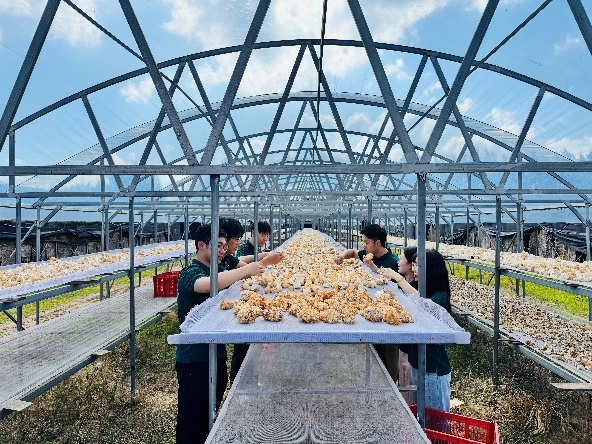 卢经理带领实践队成员进入猴头菇大棚,刚掀开棚帘,一股带着湿润感的菌香扑面而来。卢经理向队员们介绍起猴头菇的培育过程:菌袋制作的原料配比——接种后的温湿度调控——成熟采摘的判断标准。队员们围在一旁近距离观察猴头菇的生长状态,有队员问起猴头菇不同生长阶段的照料重点,有的好奇病虫害怎么防治。卢经理为队员们一一耐心解答,还拿起成熟的猴头菇示范辨别品质的方法。这场大棚里的“实践课”,让同学们对猴头菇种植有了更鲜活的认知,也真切感受到现代农业技术的力量。