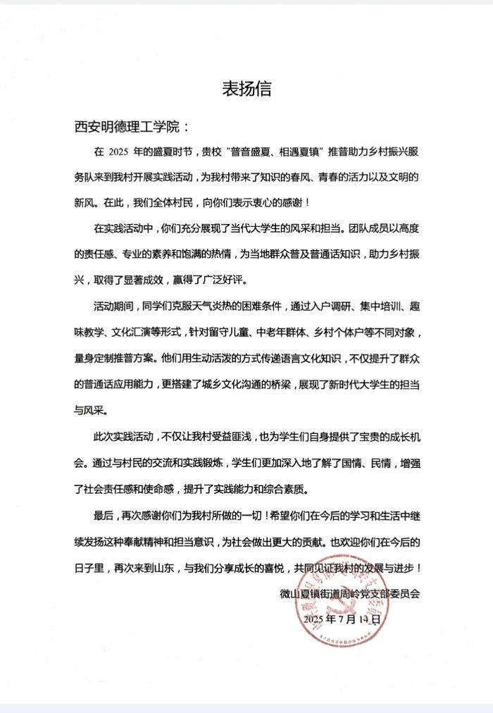 2025年盛夏,西安明德理工学院"普音盛夏·相遇夏镇"推普助力乡村振兴服务队深入微山夏镇,以"分层教学+多元形式"的创新模式开展普通话推广活动,获当地群众广泛好评。夏镇全体村民近日向学院寄送表扬信,高度评价服务队"用专业素养搭建城乡文化桥梁,以青春担当助力乡村振兴"。