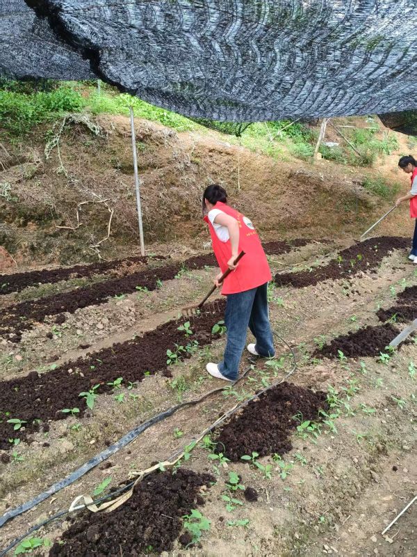 7月6日,在村支书引领下,实践队员走进田间地头,和当地农户一同为种植的中药材 “把脉问诊” 。“今年冰雹对咱这片中药材影响大,防晒网都得后期重盖,还补种不少,现在正施肥养护,就盼着能提高产量、减少损失。” 村支书向队员们说道。