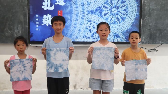 实践环节,支教组提供标准化材料(纯棉白布、蓝靛染料、皮筋、塑料盆等),学生按步骤操作:先将棉布充分浸湿,再根据设计需求进行折叠、缠绕、捆扎,随后浸入染料静置规定时长,最后拆去捆扎物完成作品。