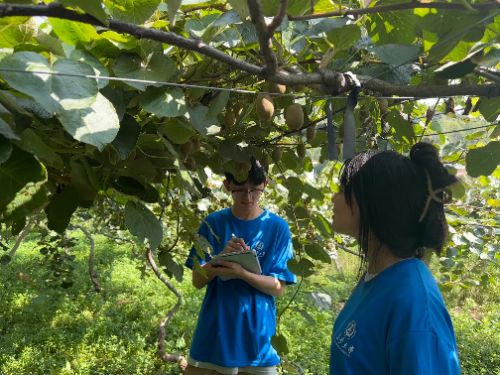 随后,实践队队员深入果园内部开展调研与讨论。在纵横交错的猕猴桃藤下,队员们观察并记录了当前阶段猕猴桃的生长状况。通过对比所记录的各项指标,队员们不仅直观地了解到不同果品的精细化管理差异,更深刻体会到基地工作人员应对市场、顺应自然的智慧与辛劳。大家表示,这不仅是“看果”,更是向扎根土地、向上生长的劳动者学习,切身感受乡村振兴的厚重责任。