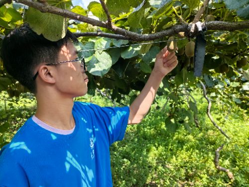 科技赋能产业,创新盘活资源。在调研过程中,实践队中有人问到藤架上的球形物,周学良解释道这是用于诱蝇的生物技术。与此同时,他还创造性地运用了生存能力强悍的水杨进行嫁接栽培,让猕猴桃们也能体验“架空感”。实践队员们切实体会到科技的力量足以打破空间与时间的壁垒,创新能让人大胆突破、敢想敢做。