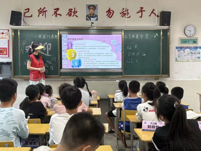 在信息化时代,网络诈骗手段层出不穷,社会经验相对不足的小学生常成为不法分子的目标。为提升小学生的防诈骗意识,守护孩子们的人身财产安全,7月19日上午,湘潭大学化学学院赴湘潭县乌石镇暑期调研团踏入乌石镇彭德怀红军小学,开展"防诈骗:守护财产安全"主题宣讲活动,为校园注入防诈"强心针"。