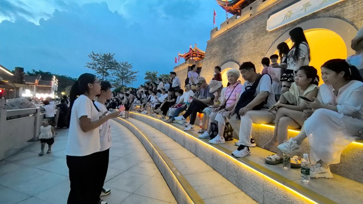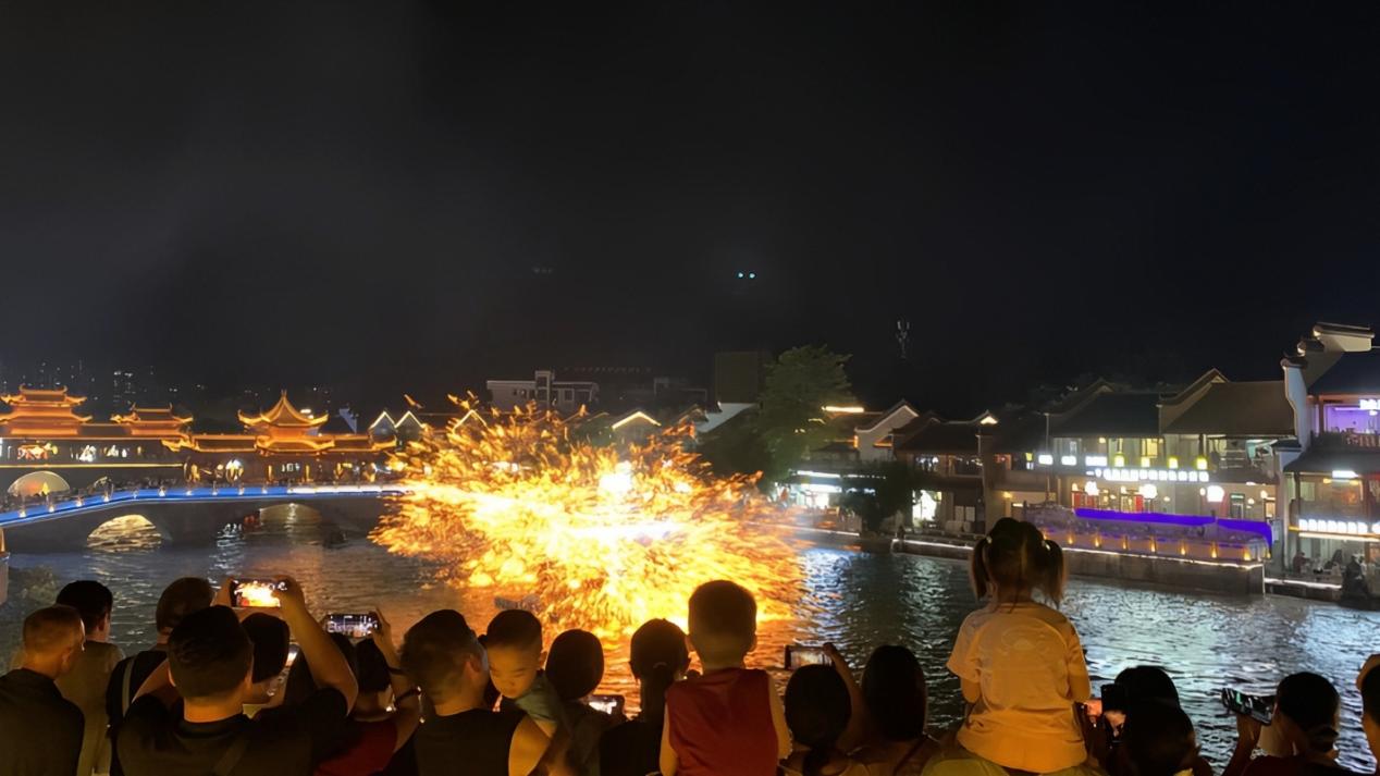 图为实践队与群众在太平古城参观非遗文化技艺“打铁花”。吴慧榕摄